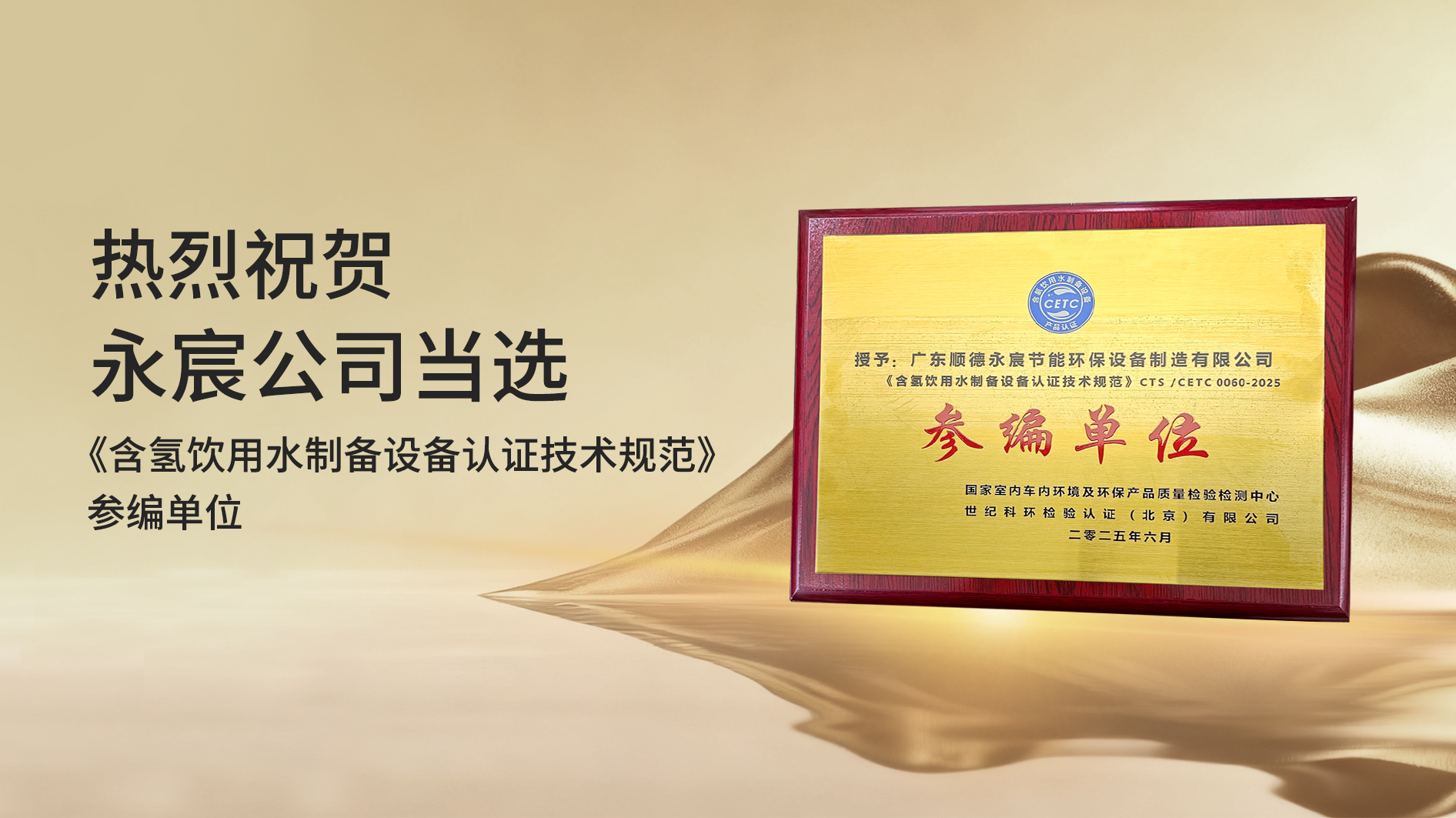 • 標準為翼,“氫”松啟航 | 熱烈祝賀永宸公司 當選《含氫飲用水制備設備認證技術規范》參編單位之一